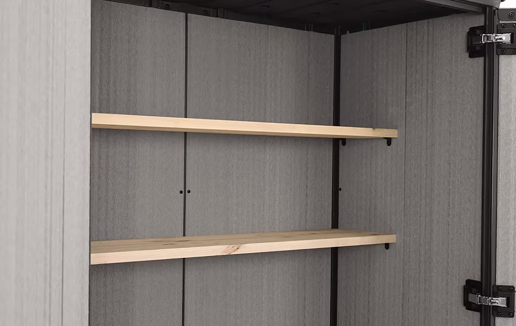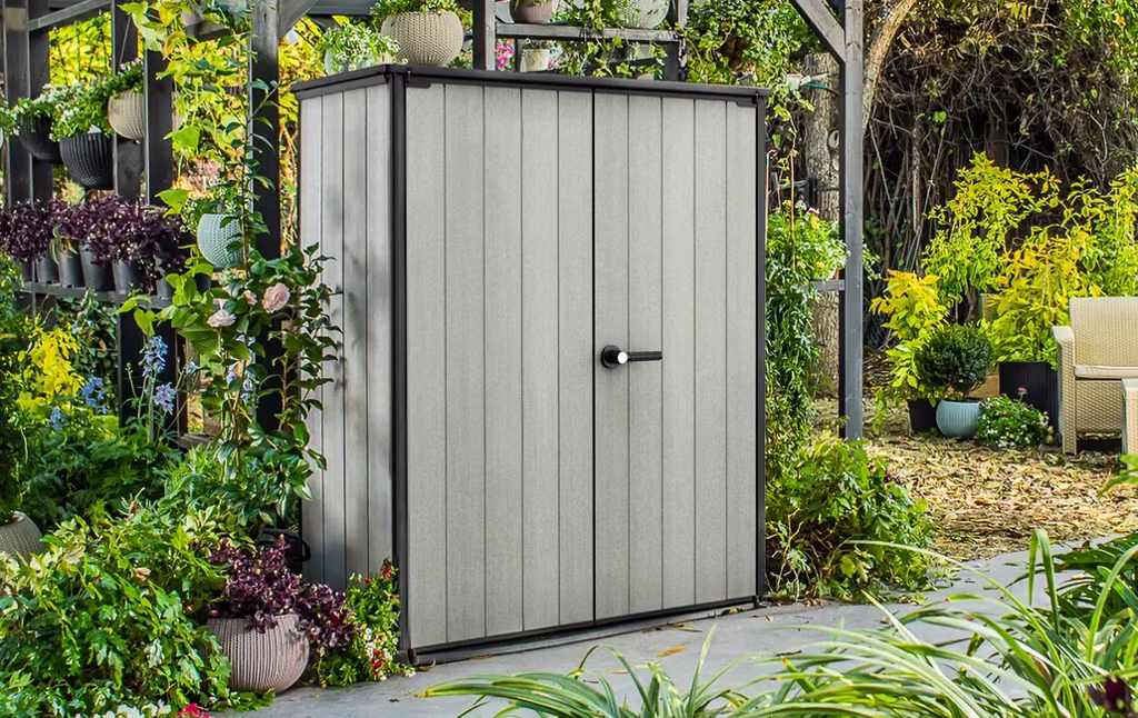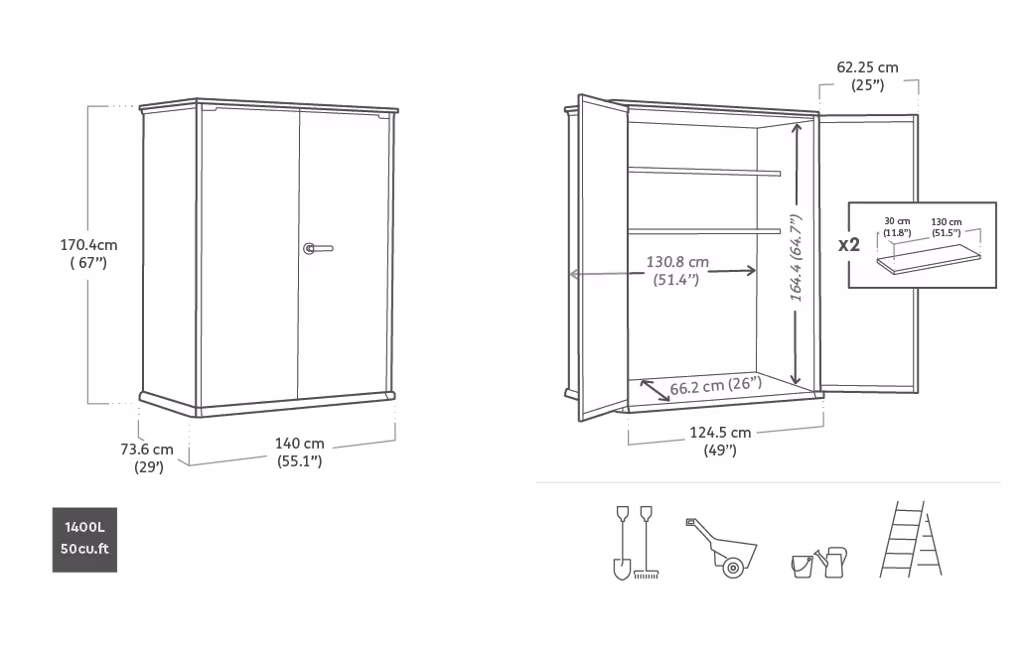 מחסן גינה היי סטור פלוס- פתרון אחסון חוץ מעוצב, מרווח ונוח המתאים לאחסון כלי גינה,כלי עבודה, או כל מה שחשוב לנו שישאר יבש ומוגן. מצויד בשני מדפים לארגון וניצול חלל האחסון בצורה מיטבית, בדלתות רחבות לגישה נוחה לתכולה וברצפה חזקה לאחסנת ציוד גינון, כלי עבודה ופריטי ציוד נוספים ללא חשש שיירטבו או יתלכלכו בבוץ. קירות המחסן עשויים מחומר DUOTECH™ המתקדם והעמיד בפני פגעי מזג האוויר לאורך זמן אותם ניתן לצבוע על מנת להוסיף מגע אישי ולהתאים את מראה המחסן לסביבה.