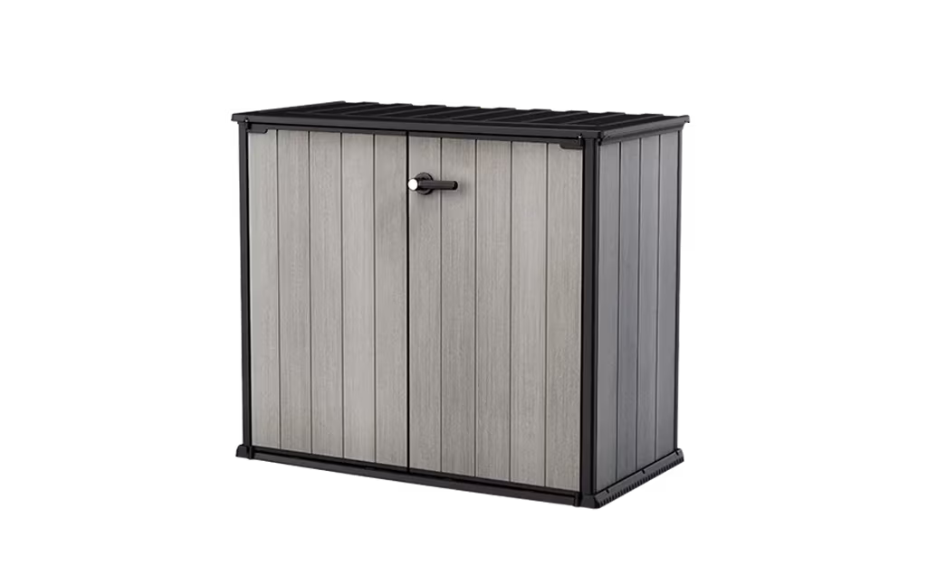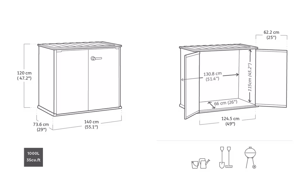 מחסן גינה פטיו- פתרון האחסון האולטימטיבי בסגנון כפרי קלאסי עם נפח אחסון של 1,000 ליטר. יכול לשמש גם כארון שירות למרפסת, עשוי מחומר DUOTECH™ המתקדם והעמיד בפני פגעי מזג האוויר לאורך זמן ללא תחזוקה ועוזר לשמור על הסדר והניקיון במרפסת ובגינה. מתאים לאחסנת ריהוט גן, אביזרים לבריכה, כלי עבודה ואפילו מכסחת דשא, גג המשמש כמדף שעליו ניתן להניח עציצים או כלי עבודה וסף כניסה משופע לגלגול חפצים כבדים בקלות פנימה והחוצה.