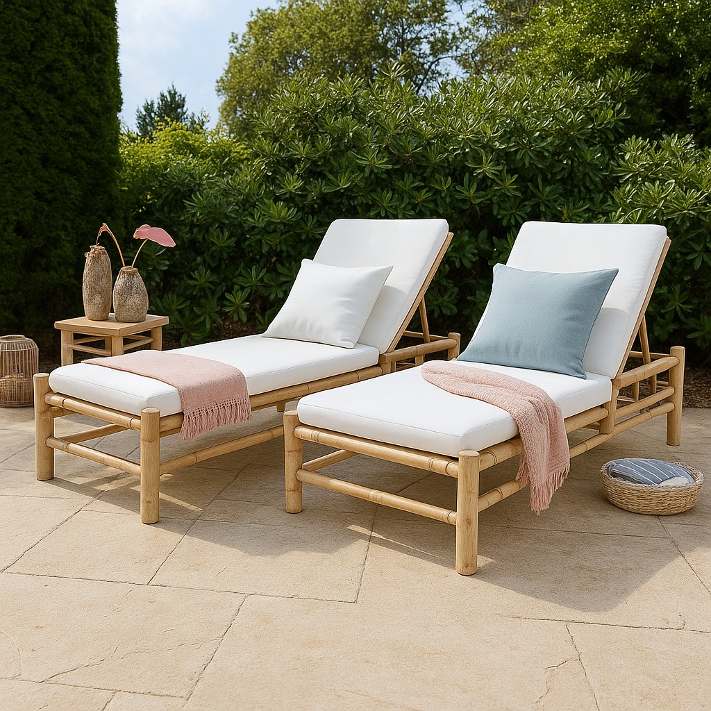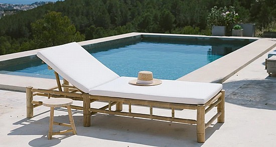 מיטת שיזוף במראה טבעי ומיוחד, עשוי במבוק, להשתרעות מפנקת במיוחד בחצר, במלון או בחצר תמיד מפוארת למראה.