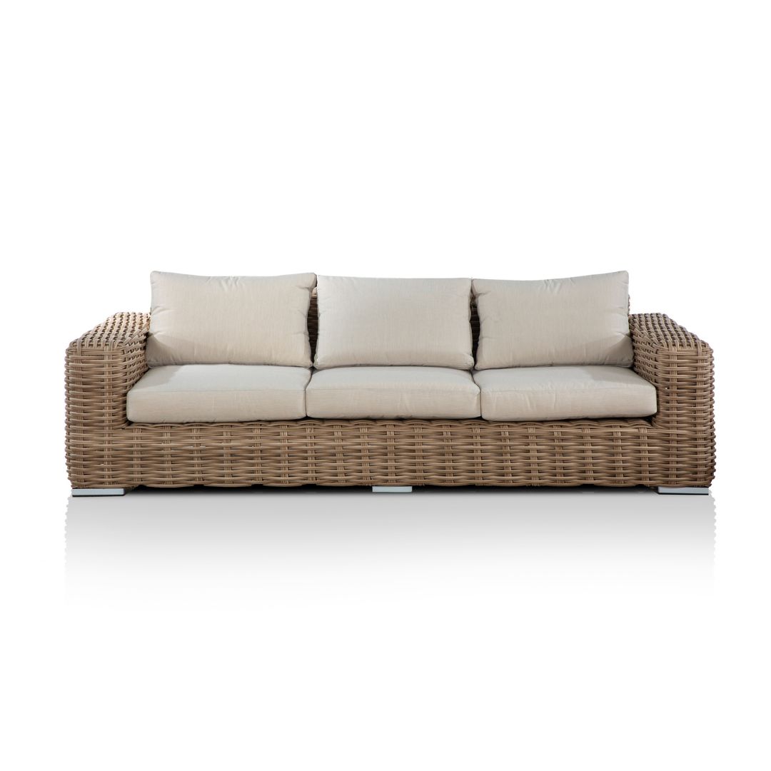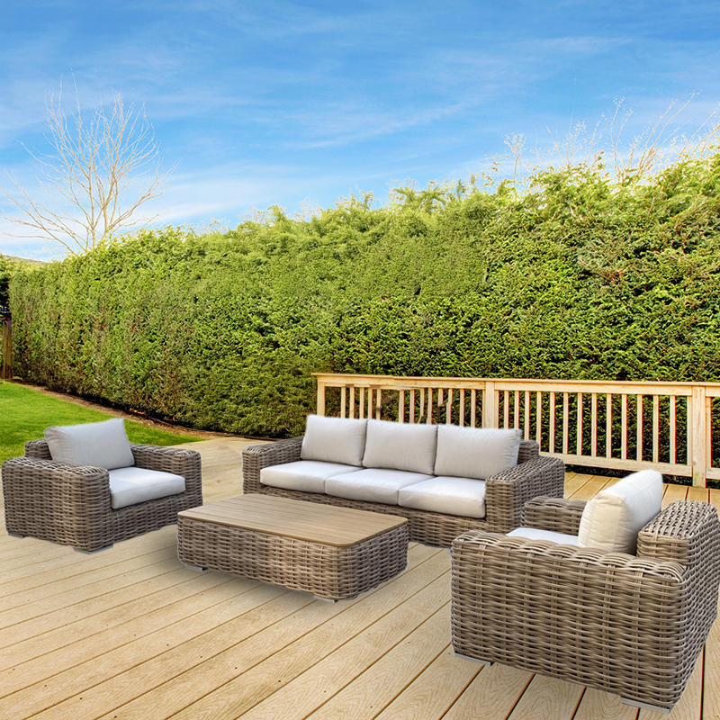 סט ריהוט גן מפנק מדגם ברמודה מורכב מספה תלת-מושבית, שתי כורסאות יחיד, ושולחן קפה סלוני מעוצב, עם משטח זכוכית עליון.