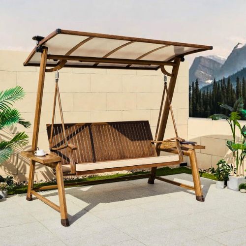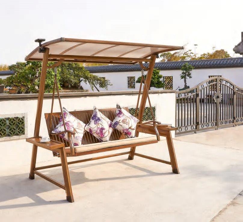 הנדנדה עשויה אלומיניום דמוי עץ ומשלבת תאורה סולארית הנטענת מקרני השמש.