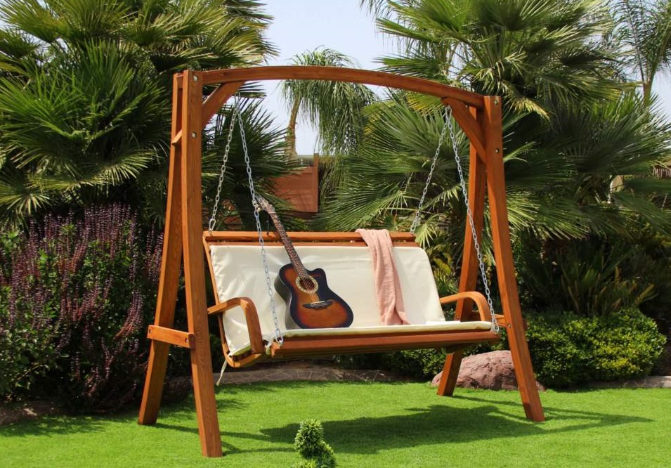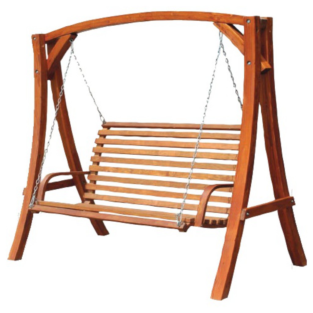 נדנדת גן מעץ מעוצבת ואלגנטית, עשויה מקורות עץ מכופפים מסיביים וחזקים, בצבע עץ טיק.