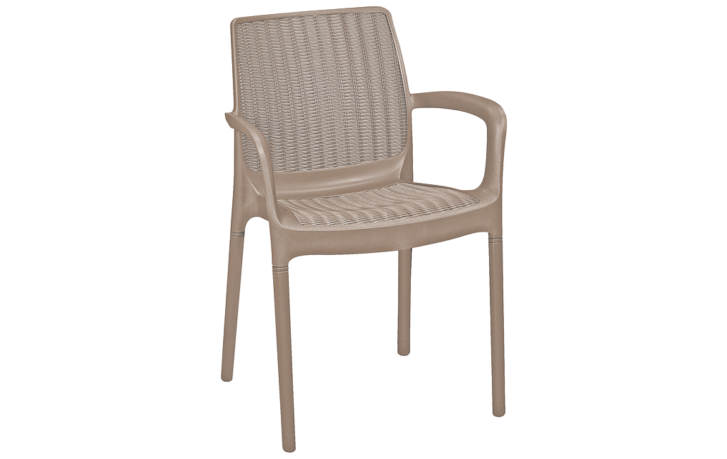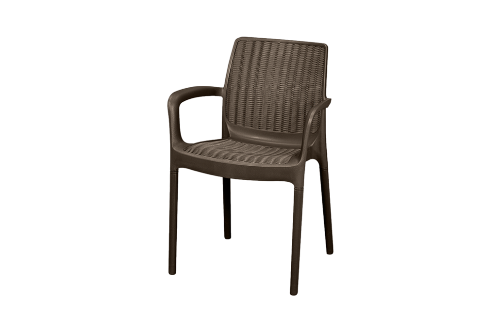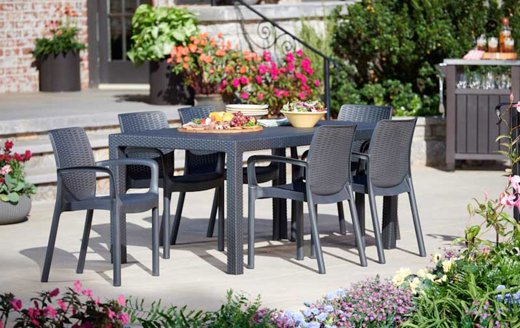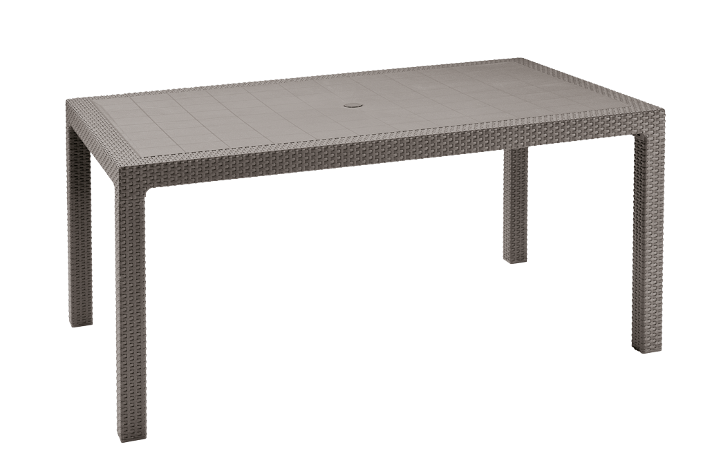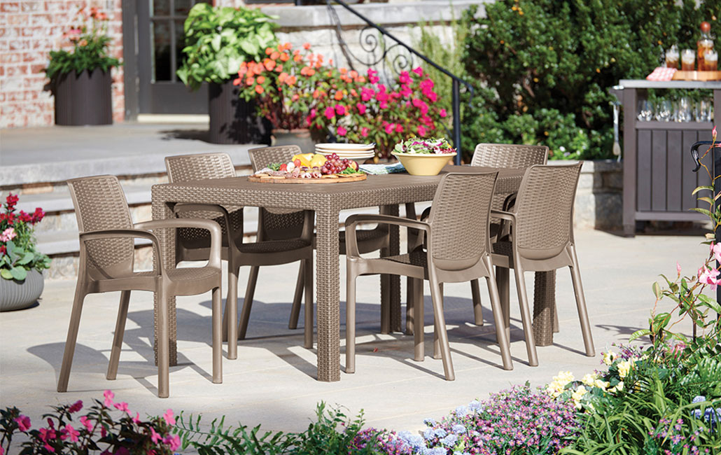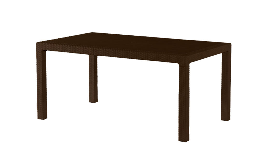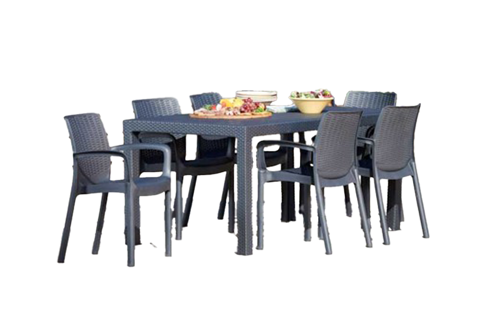 מראה קלאסי בטקסטורה דמויית ראטן ארוג. השולחן והכיסאות האיכותיים עמידים בפני פגעי מזג האוויר.