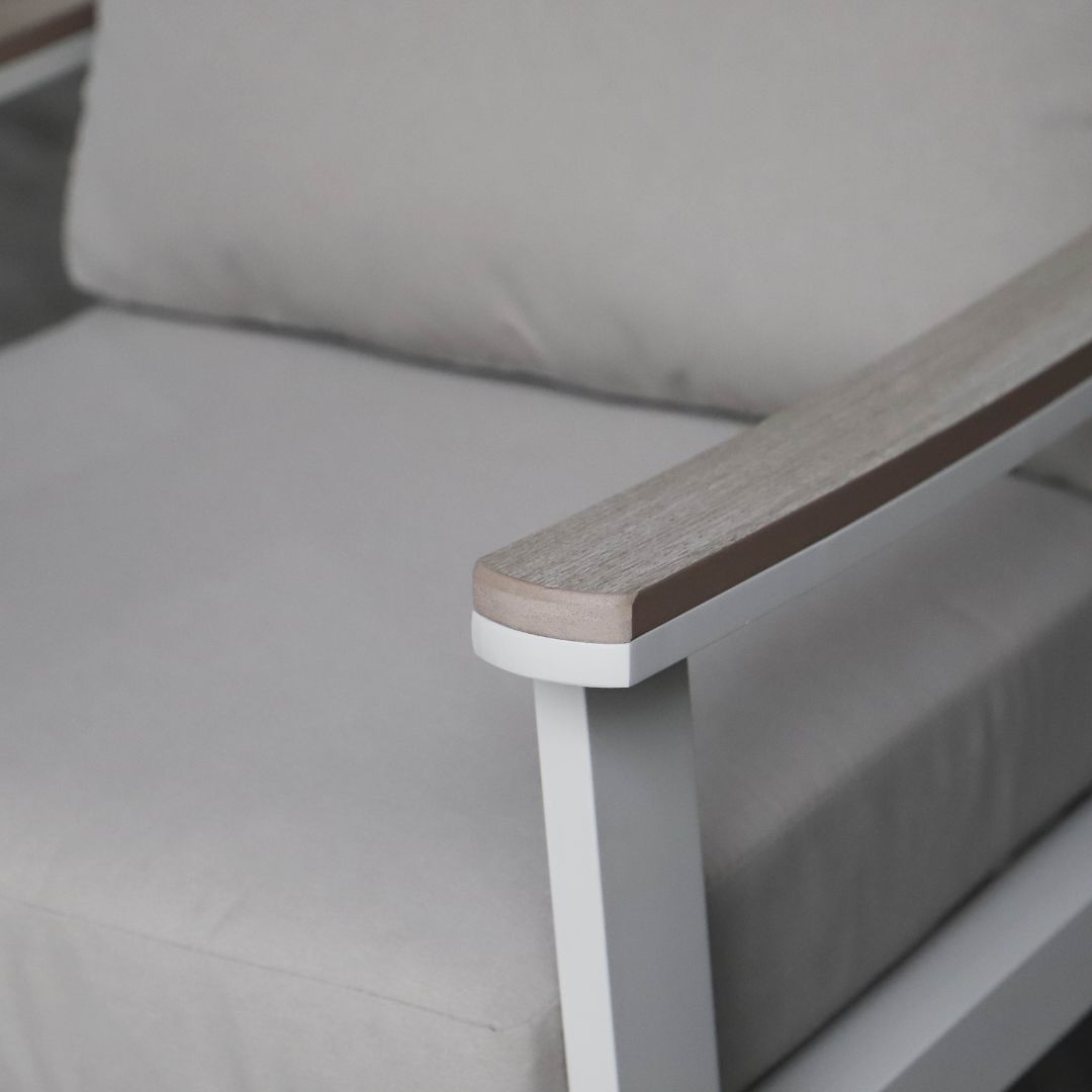 סט ריהוט הגן מורכב מספה תלת-מושבית, שתי כורסאות יחיד ושולחן גבוה ומעוצב המשמש בקלות גם כשולחן אוכל עשוי שלדת אלומיניום עמיד בתנאי חוץ.