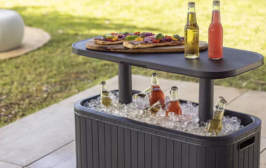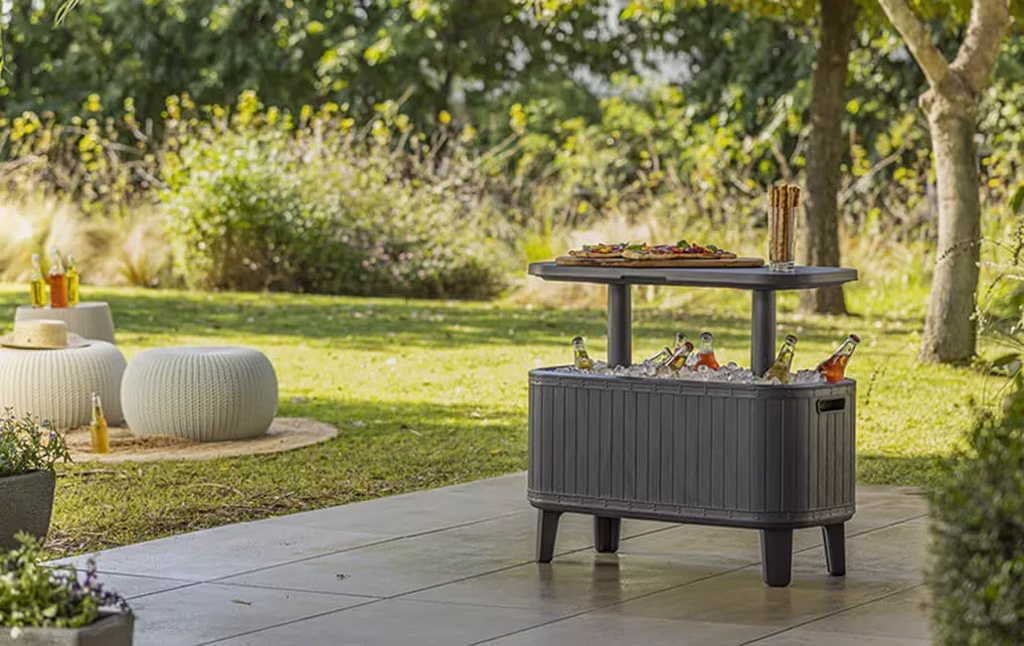 במראה עץ אופנתי, חלקו התחתון של בר המשקאות משמש כצידנית גדולה לצינון בקבוקי יין, בירה ומשקאות קלים, בעוד שהמכסה משמש כמגש להנחת קוקטיילים, מתאבנים ושאר נשנושים כך שהם יהיו תמיד בהישג יד.
